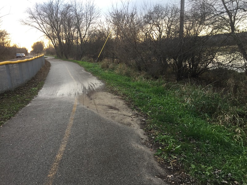 There is an industrial road that runs along the river. It’s private and full of potholes, but we drove down it anyway. Between the road and the river is a bike trail, which is separated from the road by a fence. At I-355 the trail meets Veteran’s Memorial Trail toward Woodridge. We looked for a parking lot so we could walk the trail, but didn’t find one. There was no real place to leave the car, and no break in the fence. So we went back to the access road near Lemont Road and entered the trail there.